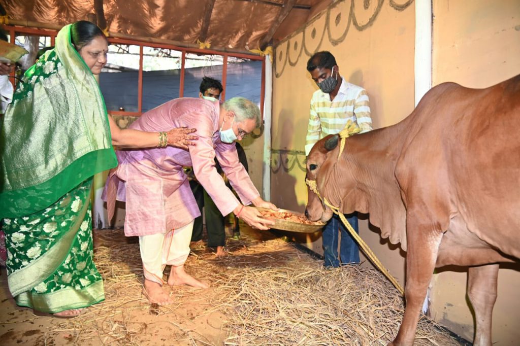 रायपुर। मुख्यमंत्री भूपेश बघेल के रायपुर स्थित निवास पर देवारी तिहार और गोवर्धन पूजा का उत्सव पारंपरिक हर्षाेल्लास के बीच धूमधाम और उत्साह पूर्वक मनाया गया। इस मौके पर मुख्यमंत्री श्री भूपेश बघेल ने अपनी धर्मपत्नी श्रीमती मुक्तेश्वरी बघेल और परिवार के सदस्यों के साथ गौरा-गौरी और गोवर्धन पूजा की और गौमाता को खिचड़ी खिलाकर प्रदेश की सुख-समृद्धि और खुशहाली की मंगलकामना की।
