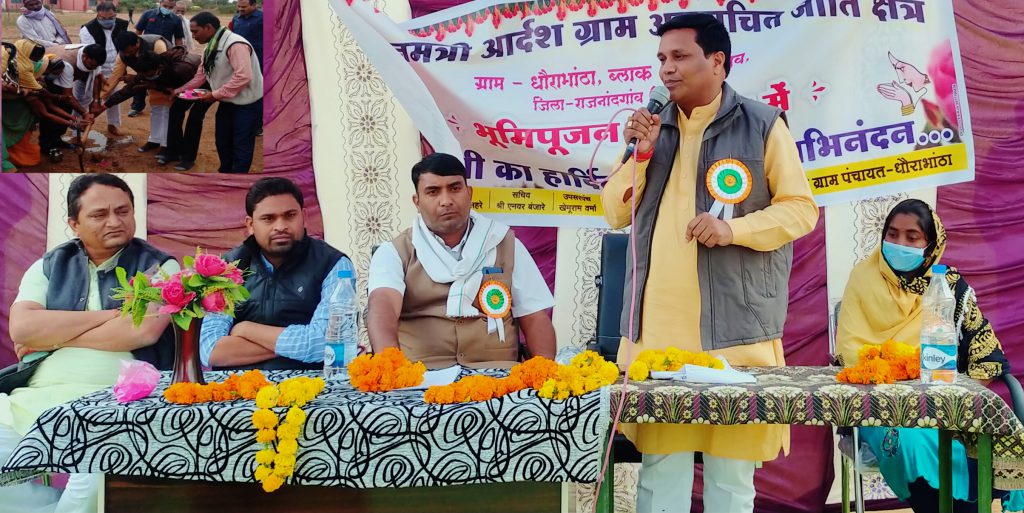उल्लेखनीय है कि 5 वर्षो पुर्व कबीरपंथ के राष्ट्रीय स्तर पर आयोजित संत समागम से प्रदेशभर में पहचाने जाने वाले ग्राम में वर्तमान राज्य ने प्राधिकरण व आयोग के माध्यम से विकास व निर्माण कार्यो की सौगात दी है। भूमिपूजन अवसर पर मुख्यअतिथि आयोग अध्यक्ष भुनेश्वर बघेल ने कहा कि राज्य सरकार में मुख्यमंत्री भूपेश बघेल अनुसूचित जाति क्षेत्र को भी प्राथमिकता में रखते हुए समाज के सर्वागींण विकास की नीति व योजनाओं पर कार्य कर रहे हैं। समाजिक कार्यो में सक्रिय रहते हुए जिला पंचायत सदस्य निर्वाचित होने के बाद भी सामाजिक स्तर पर सेवाएँ देते आ रहे हैं। इसी का परिणाम है कि मुख्यमंत्री ने उन्हे डोंगरगढ़ विधायक निर्वाचित होने के बाद प्रदेशभर के दूरस्थ अनूसूचित ग्रामों तक विकास की गति तेज करने के आयोग के अध्यक्ष की जिम्मेदारी सौंपी है। डोंगरगांव विधायक दलेश्वर साहू ने कहा कि धौराभाठा डोंगरगांव विधानसभा का इकलोता गांव है, जहां ग्रामीण विकास प्राधिकरण एवं अनूसूचित जाति आयोग के माध्यम से विकासकार्यो की स्वीकृति मिली है। विधायक ने निर्माणकार्यो की मानिटरिंग करते हुए गुणवत्तापूर्ण निर्माण में योगदान देने अपील की।